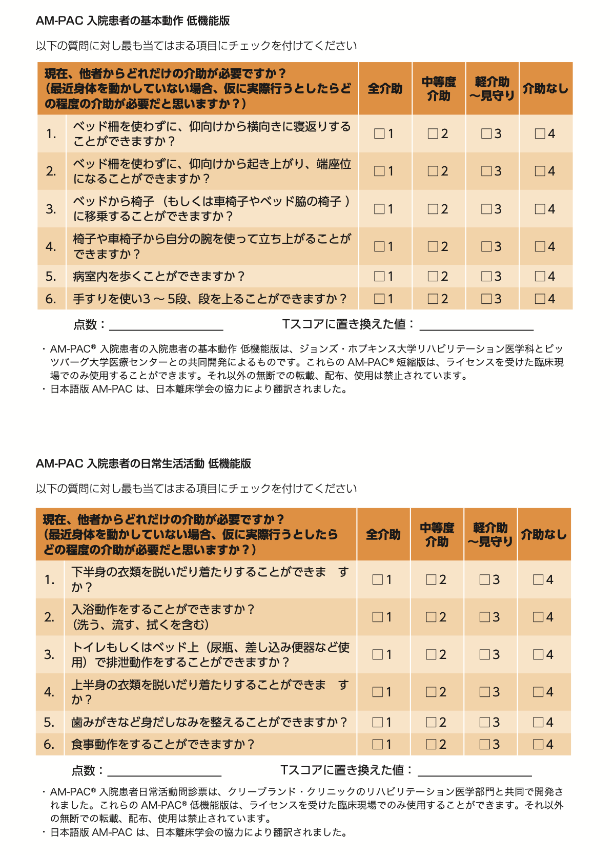 AM-PACは、基本動作(131項目)、日常動作(88項目)、応用認知(50項目)の269項目から構成されるコンピュータ化適応テスト(Computer-Adaptive Testing 以下CAT)です。各領域には幅広い難易度の項目があり、項目反応理論を用いて調整されています。AM-PACはこれらの評価をコンピュータへ入力することにより結果が算出されるツールであり、開発者による研究が進み、CATを使用せず評価可能である低機能版が開発されました。今回翻訳を行った2種類の低機能版は基本動作、日常生活活動共に8項目を評価することにより簡単にスコア化が可能となるツールです。