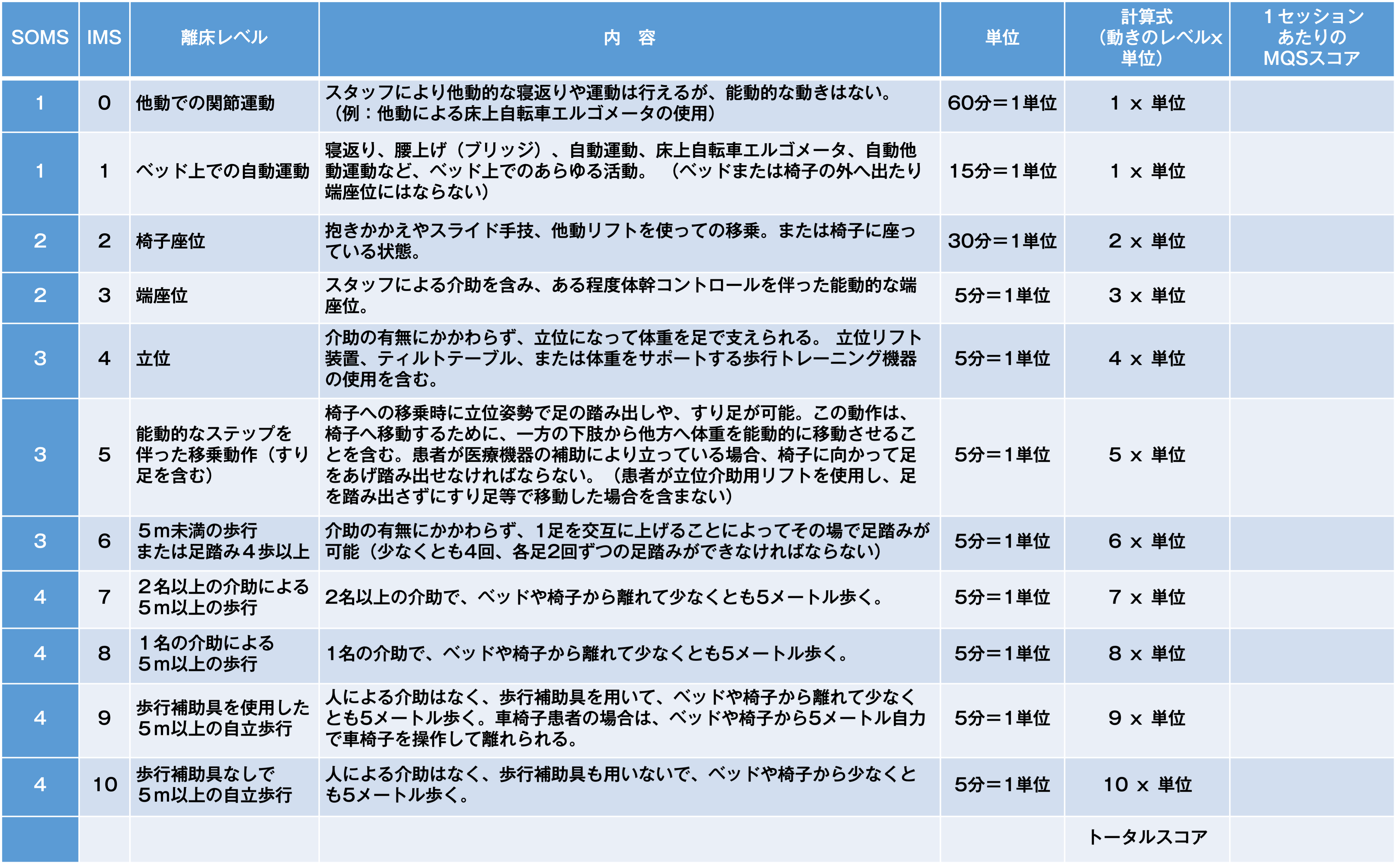 MQS(Mobilization Quantification Score)は、行った離床の量を測定できるツールです。動きのレベルと時間を積算して求めることで、介入量を数値化し、可視化することが可能です。