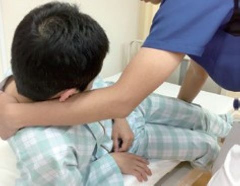 軽介助の患者さんの場合では、常に動作の方向や、目線の先を邪魔しないように介助することを心がけることが重要です。写真のように、起き上がり時に頚部を支えている介助者の上肢は、患者さんにとっては、徐々に顔に腕が近づいてくるように感じます。