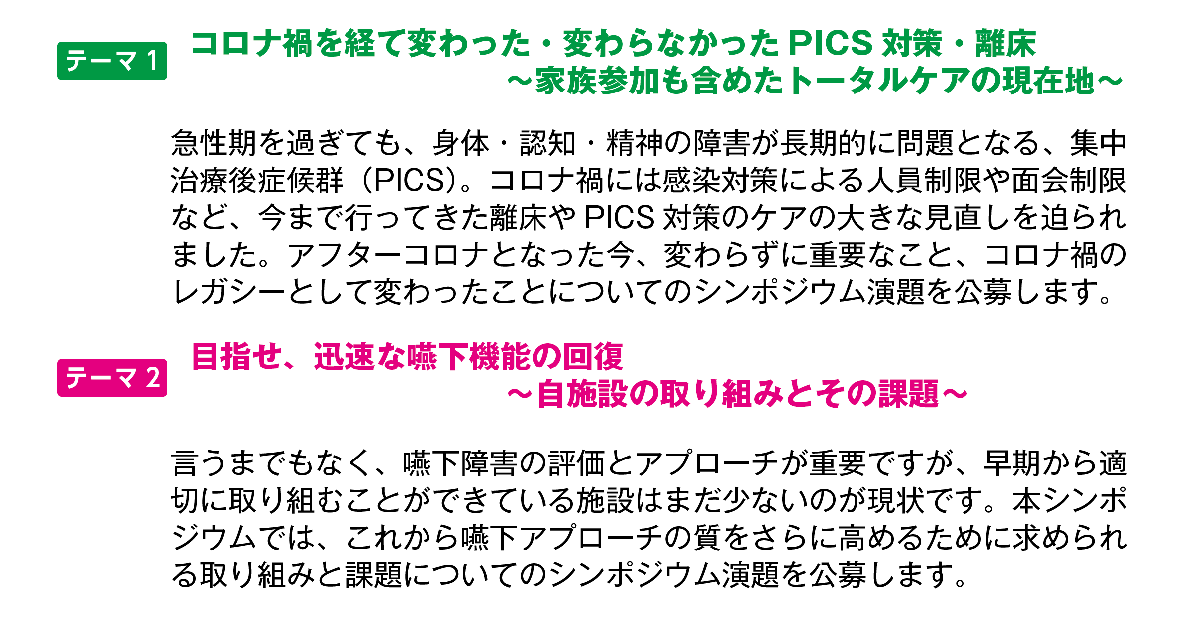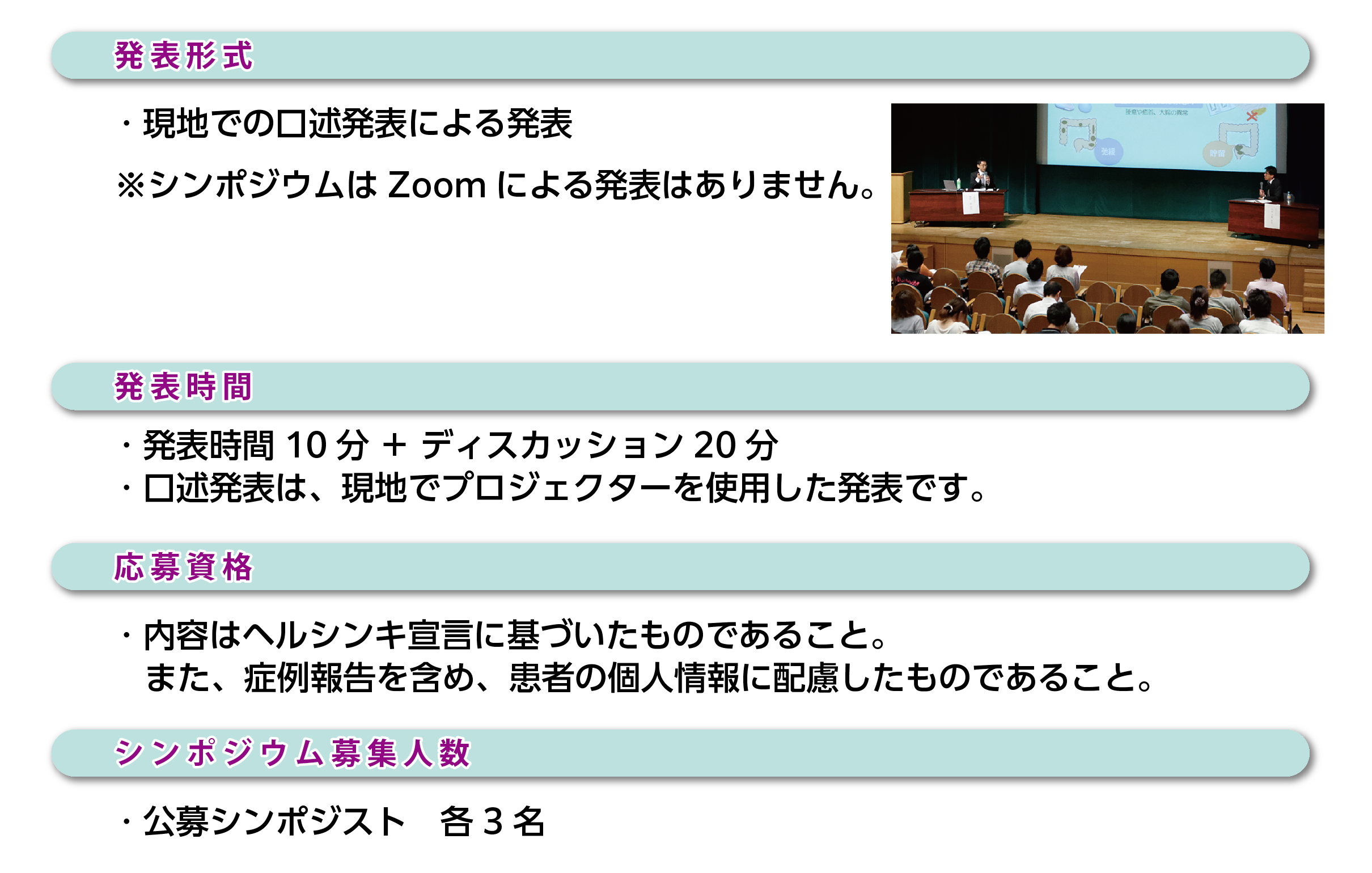 ※シンポジウム演題で応募された先生の中から、一般演題に採択させていただく場合がございます。その場合、プログラム委員会からお願いすることがございますので、ご了承ください。