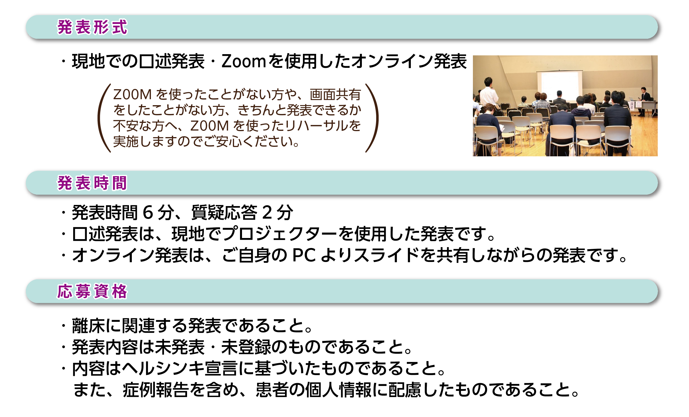 - 発表形式はプロジェクターを使用した、PCによる発表です。発表スライドは、Microsoft Office Power Point(2013以上)でご用意ください。スライド枚数に制限はありませんが、発表時間を考慮して作成してください。なお、個人情報の取扱には十分に注意してスライドを作成してください。各演題発表には座長がいます。