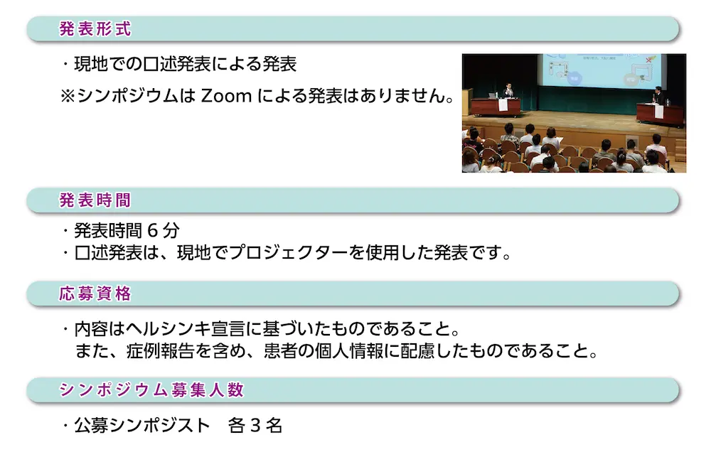 ※シンポジウム演題で応募された先生の中から、一般演題に採択させていただく場合がございます。その場合、プログラム委員会からお願いすることがございますので、ご了承ください。