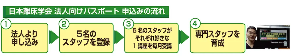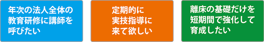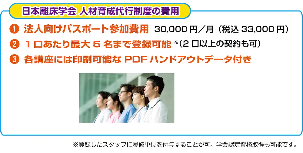 教育実績20年の日本離床学会が、「人材育成代行制度」を創設。このコースは、学会が主催する教育セミナーへの出席を通して、貴施設のスタッフ教育を行う新しいシステムです。離床の進め方、リスク管理に必要な知識・技術について、エキスパートが徹底指導し、スペシャリストを育成します。忙しくてスタッフ教育する時間が取れない、スタッフのリスキリングを進めたい、という施設は是非、当学会の教育システムをご活用ください。