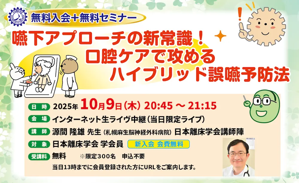 2025年10月9日(木)20時50分から開催する学会員無料セミナー「嚥下アプローチの新常識!口腔ケアで攻めるハイブリッド誤嚥予防法」に招待いたします。学会員のためだけの、とっておきの企画を、お見逃しなく。