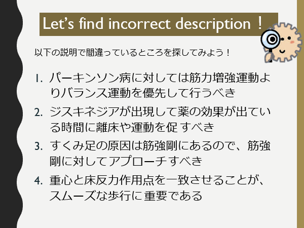 今回は、まもなく開催される新講座、「バイオメカニクスを活かした理学療法の神髄~動作分析を最大限に用いたリハビリテーションの具体策~パーキンソン病編」より、間違い探し問題を出題。パーキンソン病へのアプローチに関する知識の腕試しに、是非、チャレンジしてみてください。1つでもわからない項目がある方は、下記講座の適応あり!