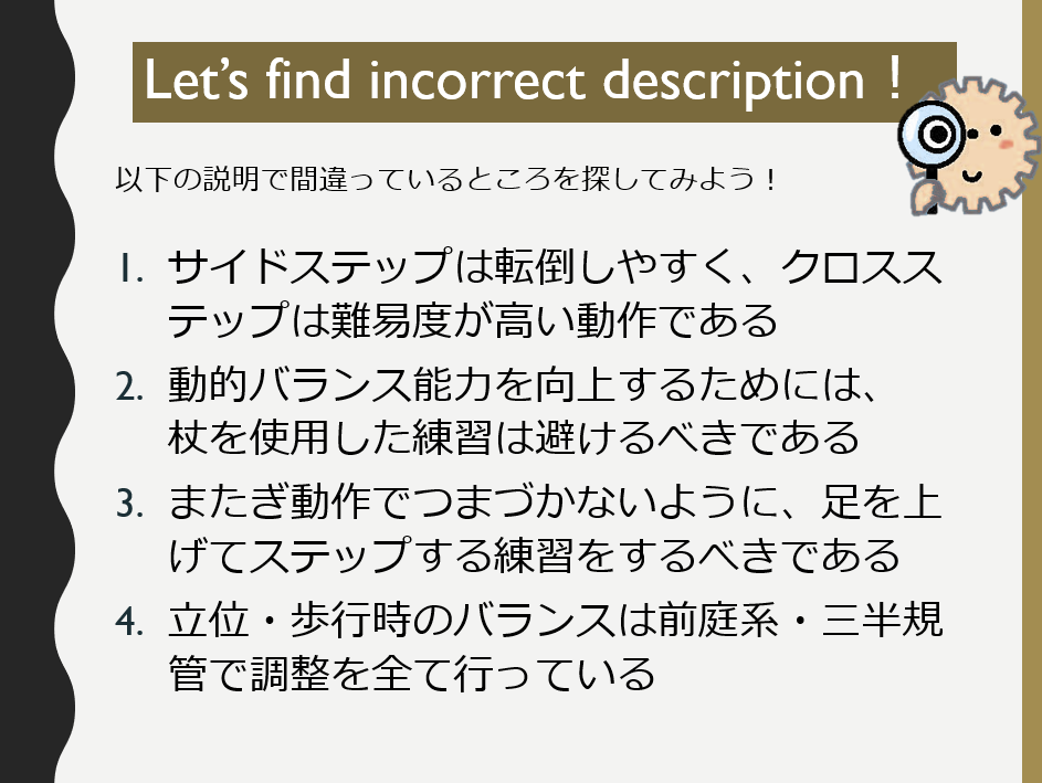 今回は、まもなく開催される新講座、「バイオメカニクスを活かした理学療法の神髄~動作分析を最大限に用いたリハビリテーションの具体策~転倒予防編」より、間違い探し問題を出題。高齢者の転倒に関する知識の腕試しに、是非、チャレンジしてみてください。1つでもわからない項目がある方は、下記講座の適応あり!