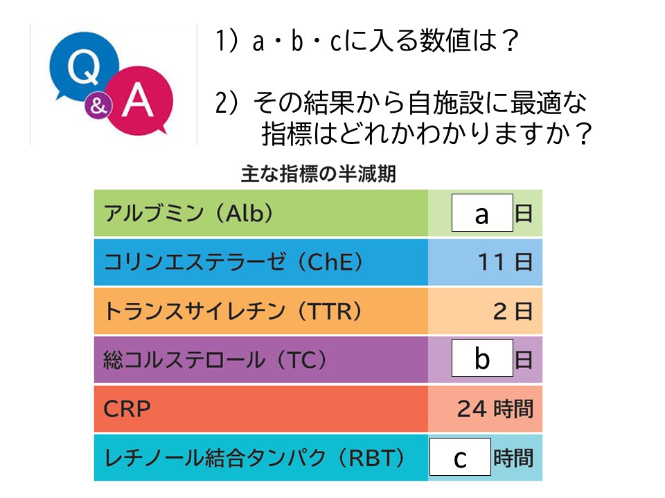 2) 急性期であればレチノール結合タンパク・トランスサイレチン・総コレステロール・CRPが指標にしやすく、回復期や生活期ではアルブミンが指標として活用しやすい。