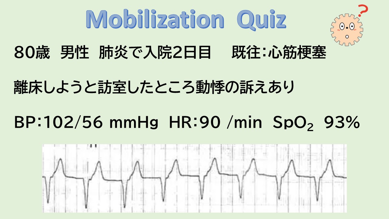 心室頻拍ではなく、心室固有調律と考えられ、循環動態と症状の変化に注意しながら離床を検討できると考えられる。