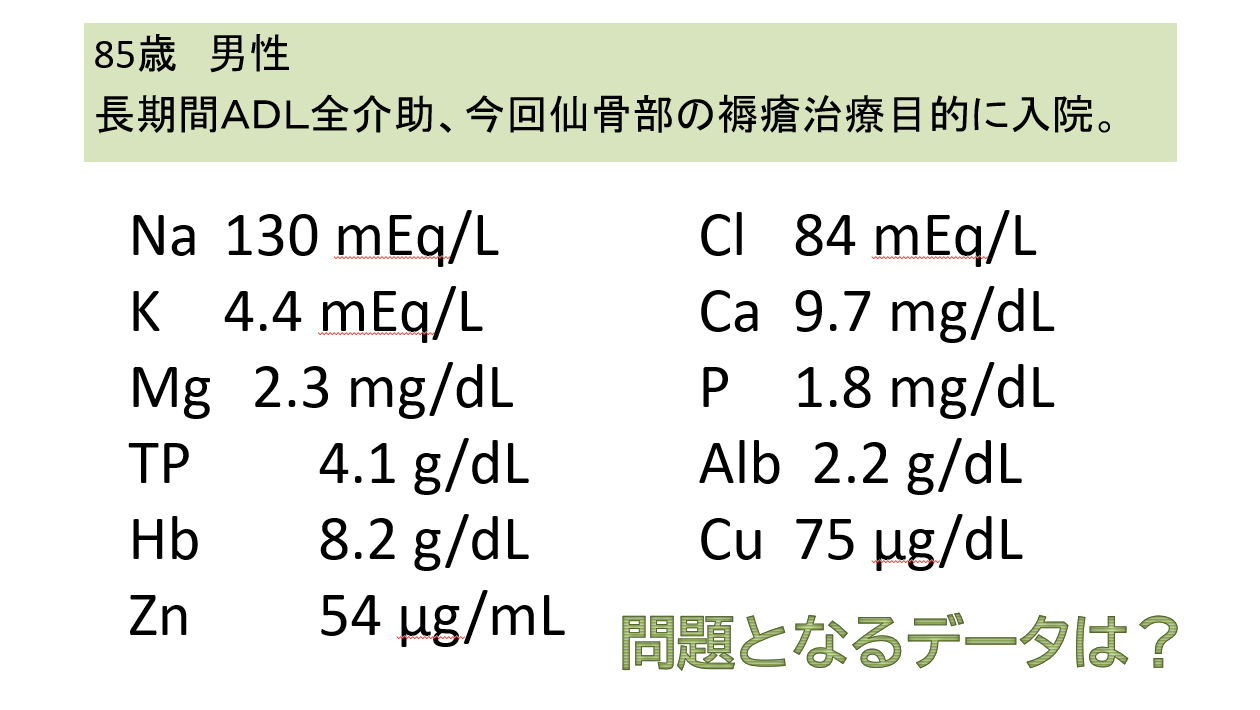 Na、TP、Alb、Hb、Cu、Znに問題があると考えられる。