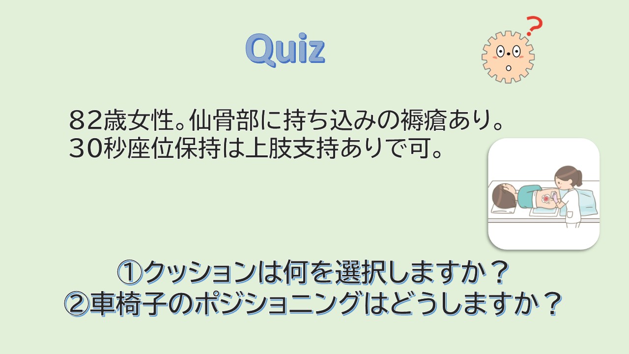 間もなく開催される当会の人気講座、「“オレ流”が患者さんを危険にさらす!?シーティング完全攻略講座〜「ただの離床」を「活動」につなげる臨床の工夫〜」より、シーティングに関する問題を出題。持ち込みの褥瘡があるときの、シーティングの実践ができますか?