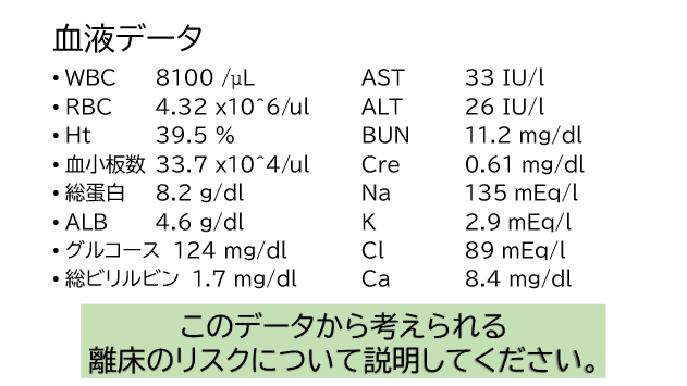 Na、Kに問題があると考えられ、離床のリスクとしては、筋力低下、けいれん、不整脈などに注意が必要と考えられます。