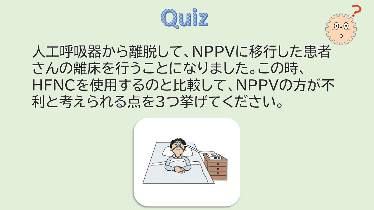 まもなく開催される、酸素療法のなぜ!?を解決するセミナー ベストな機器選択と離床編の内容より、NPPVに関する問題を出題。HFNCと比較したNPPVのデメリットは?