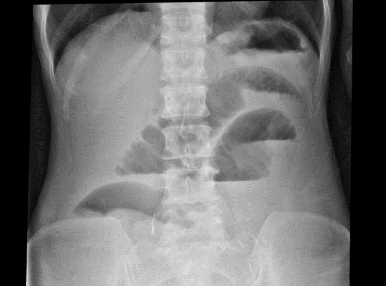 細かいひだの小腸ガスの貯留と、小腸の拡張がみられ、腸閉塞が疑われるため、離床は立ち止まり腸閉塞に対する治療・コントロールを優先すべきと考えられます。