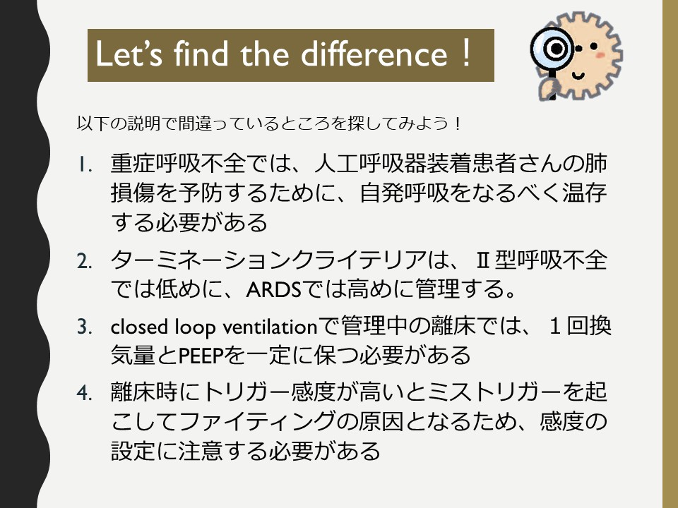 今回は、まもなく開催される新講座、「人工呼吸器マスターコース~本当は教えたくないプロの人工呼吸管理実践」より、間違い探し問題を出題。人工呼吸器に関する知識の腕試しに、是非、チャレンジしてみてください。