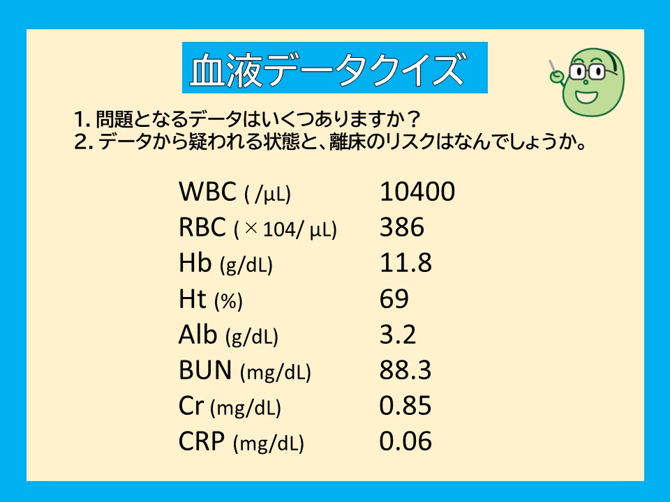突然ですが、血液データクイズを出題します。血液データを読んで、離床の注意点を説明してください。分からないという方は、下記講座の適応あり!