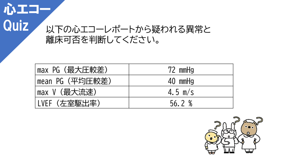 突然ですが、心エコークイズを出題します。心エコーレポート結果を読んで、離床の可否を判断してください。