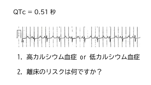 1.QT延長を認めるため、低カルシウム血症を疑う。