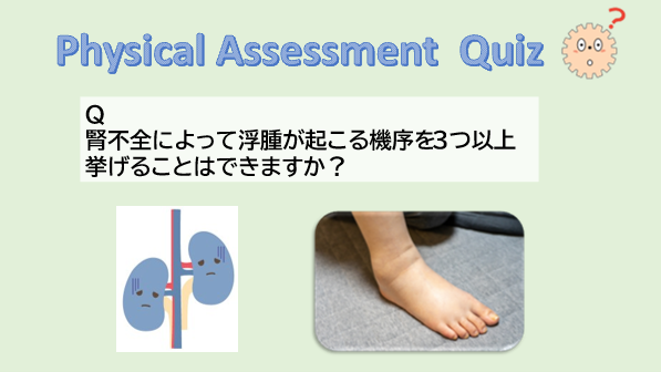 腎でのろ過機能低下による体水分過剰(毛細血管内圧上昇)、低アルブミン血症、糖尿病性腎症の場合は毛細血管壁の透過性亢進 など