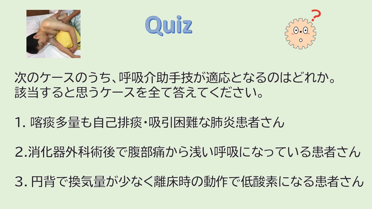 詳しい解説と、それぞれのケースに対する介助法の技術指導は「実技プレミアムコース 呼吸介助手技集中講座」で行います。