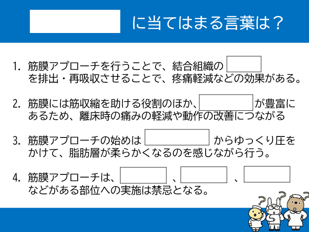 いよいよ来週に開催される人気講座、「現地東京講演 離床に役立つ「筋膜」アプローチ集中講座」の内容から、穴抜き問題をシェアします。