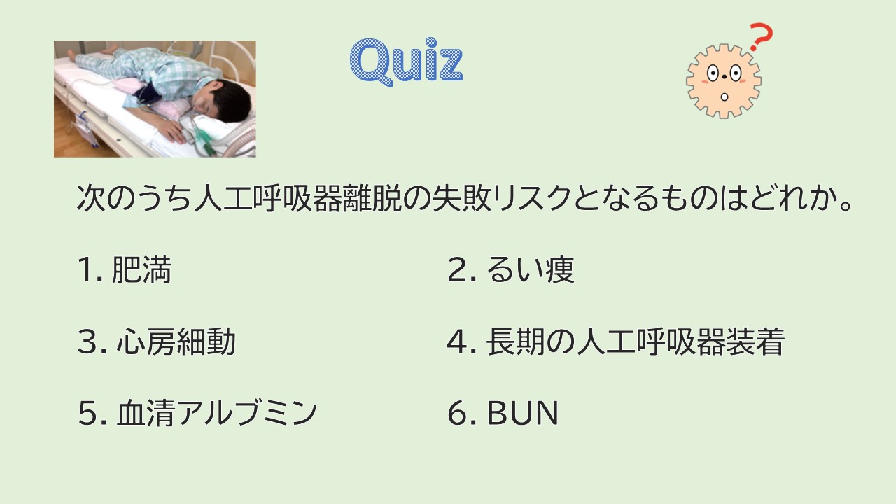 突然ですが、人工呼吸器クイズを出題します。人工呼吸器から離脱前後のアセスメント項目がわかりますか?