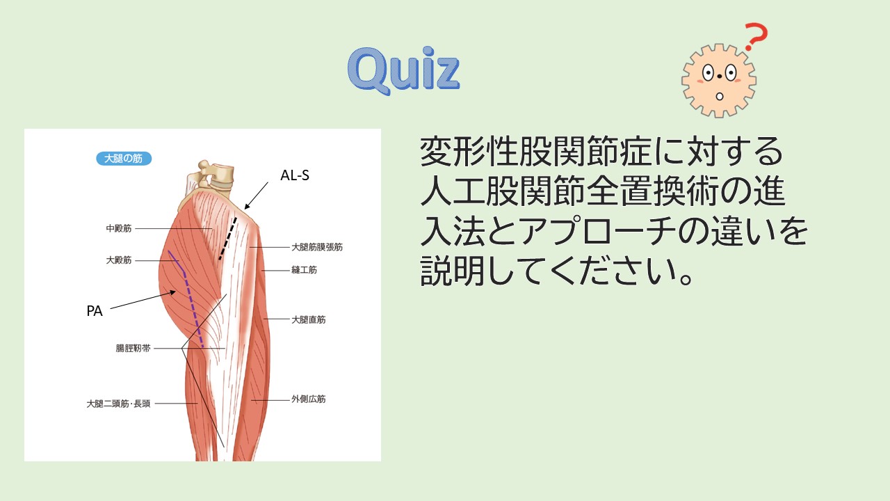 突然ですが、変形性股関節に対する人工股関節全置換術のクイズを出題します。進入法の侵襲からアプローチすべき筋がわかりますか?