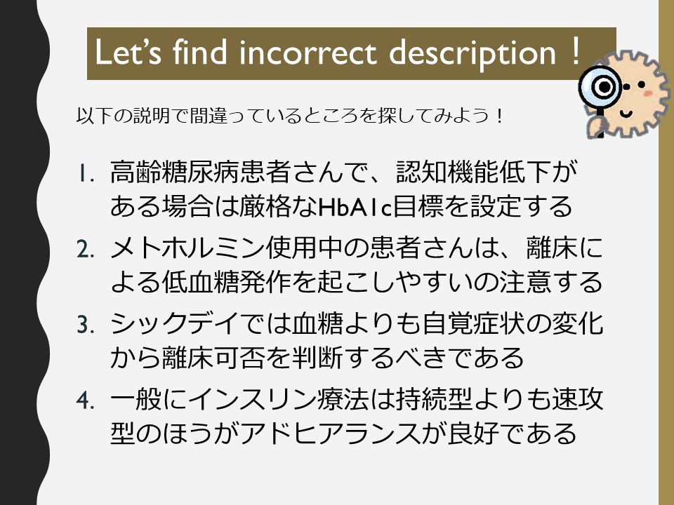 今回は、まもなく開催される新講座、「糖尿病の“なぜ” を全て解決するセミナー」より、間違い探し問題を出題。糖尿病と離床に関する知識の腕試しに、是非、チャレンジしてみてください。