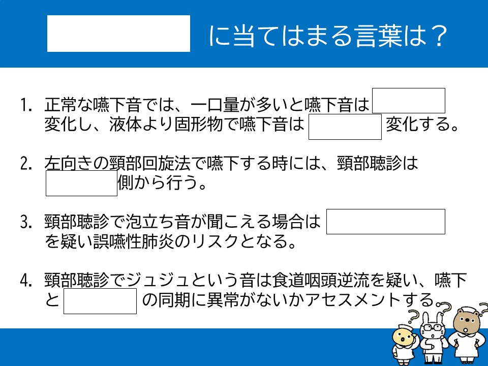 いよいよ来週に開催される人気講座、「頸部聴診法による嚥下フィジカルアセスメント実践」の内容から、穴抜き問題をシェアします。