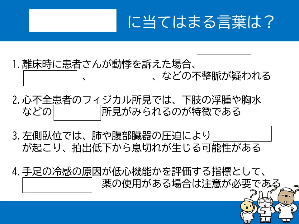 今回は今月から開催される人気講座、「“離床で急変”の恐怖から患者を守る 循環アセスメント講座」より、穴埋め問題を出題。循環アセスメント力の腕試しに、是非、チャレンジしてみてください。