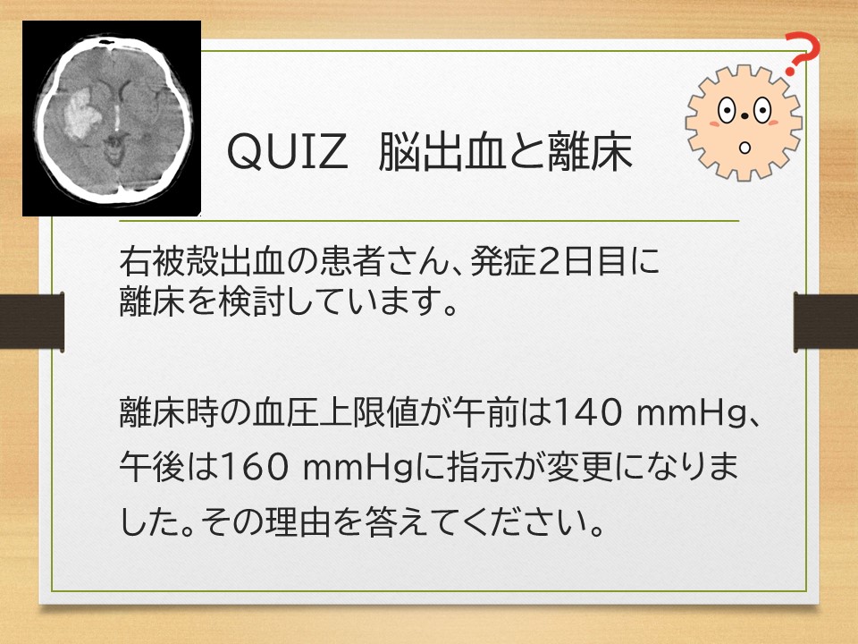突然ですが、脳出血と離床に関するクイズを出題します。同じ日に離床時の血圧上限値が変わったのはなぜ?