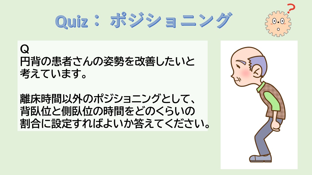 「達人に学ぶ動作介助・体位管理の勘ドコロ~ 5 年10 年先を考えたポジショニング・シーティング・ノーリフティングの実際~」の講座の内容から、臨床力アップに役立つポジショニングクイズを出題。