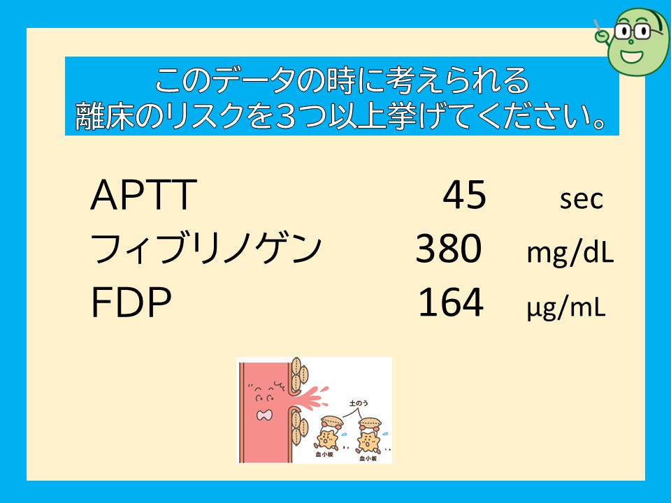データから播種性血管内凝固症候群と考えられるため、離床により、出血性合併症の発生、炎症状態の亢進、呼吸状態の悪化などのリスクが考えられます。