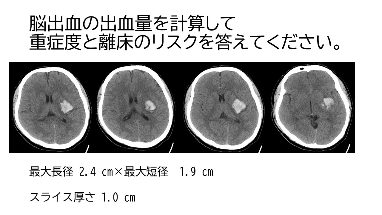 出血量は約9 mL。出血量からは軽症から中等症と考えられ、離床は血圧変動や頭蓋内圧亢進症状に注意しながら進めることができると考えられる。