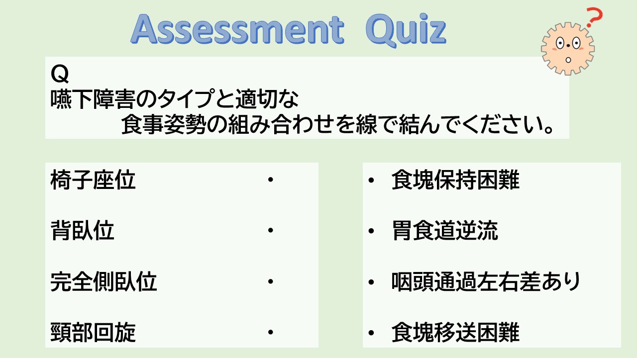 突然ですが、嚥下障害と姿勢のクイズを出題します。嚥下障害と適切な姿勢の組み合わせがわかりますか?