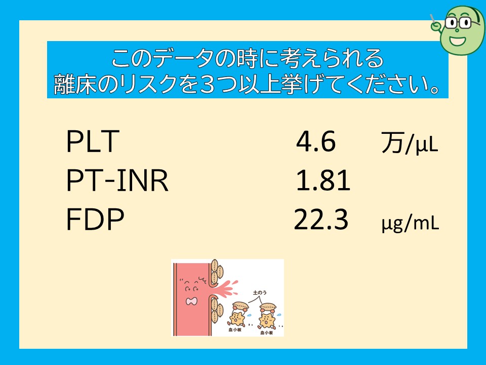 データから播種性血管内凝固症候群と考えられるため、離床により、出血性合併症の発生、炎症状態の亢進、呼吸状態の悪化などのリスクが考えられます。