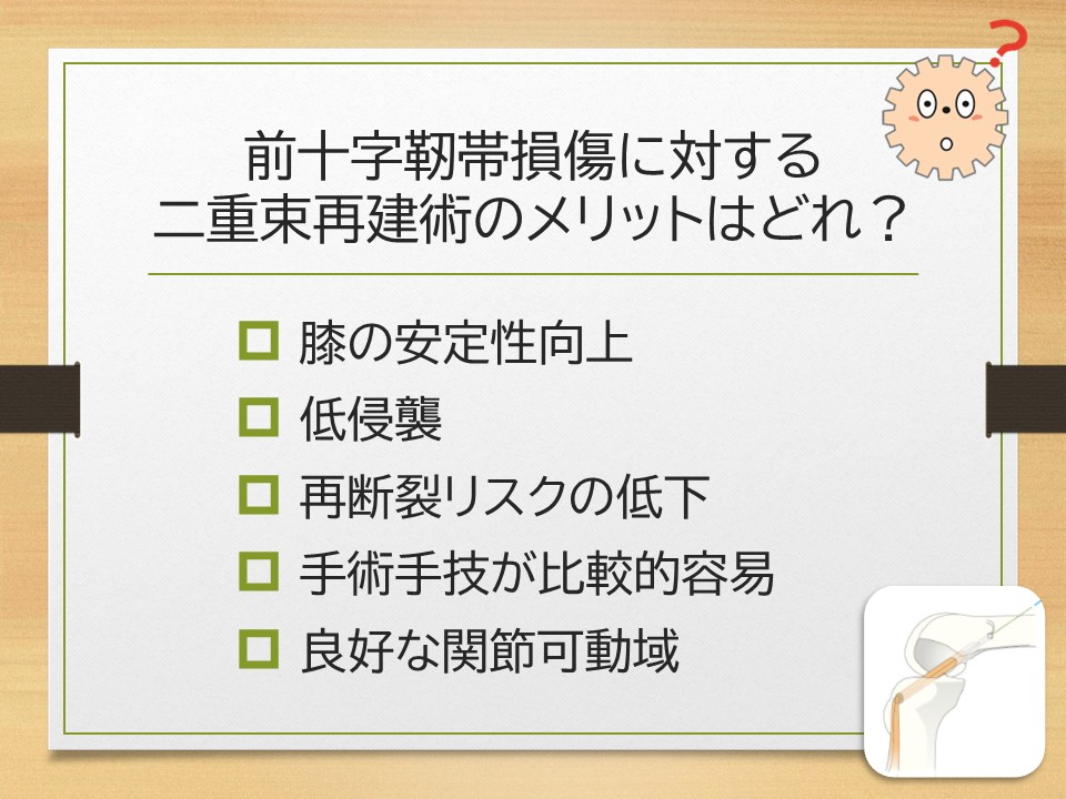 一重束再建術に対する二重束再建術のメリットは、膝関節の安定性向上と、再断裂リスクの低下については優れているといわれています。