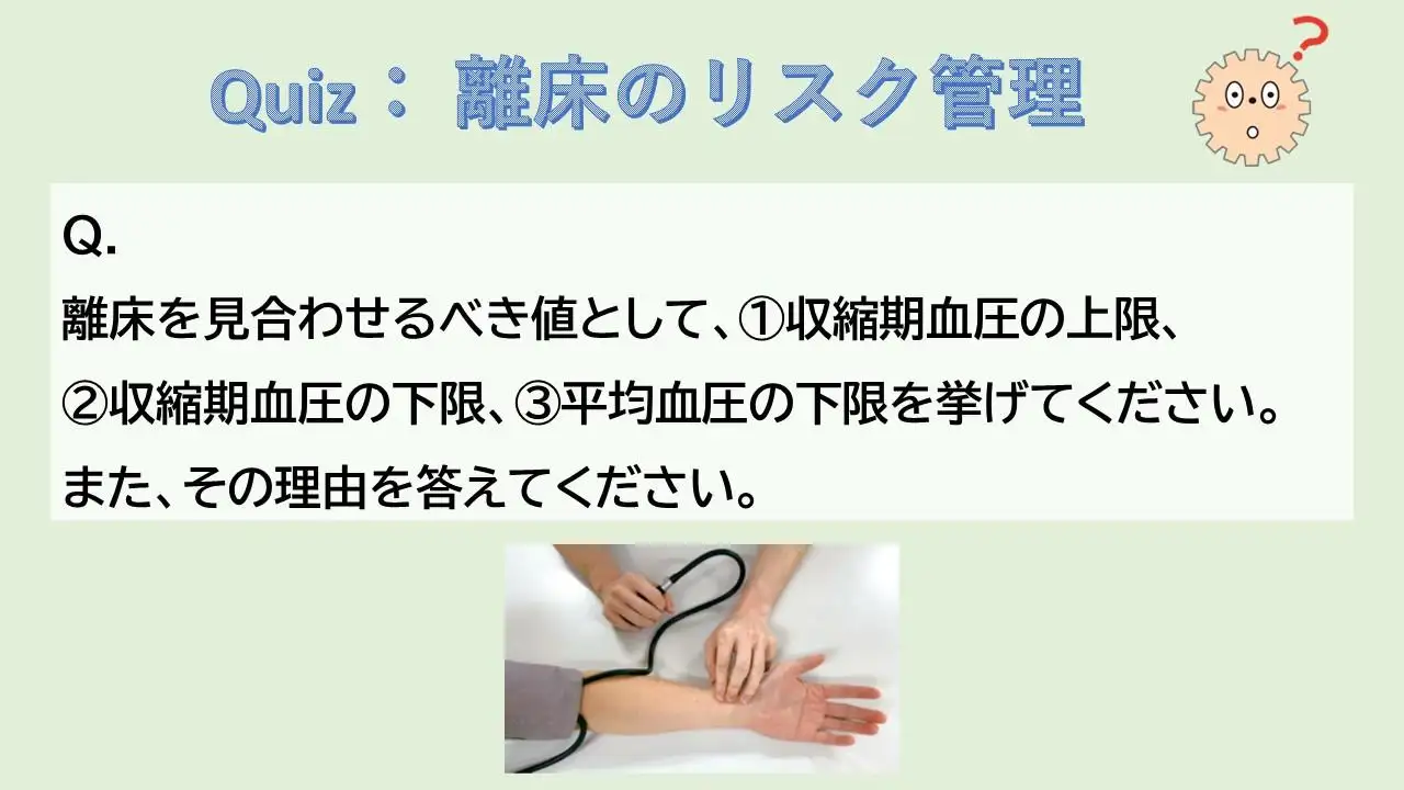 上記講座では、血圧と離床のリスク管理について詳しい解説があります。