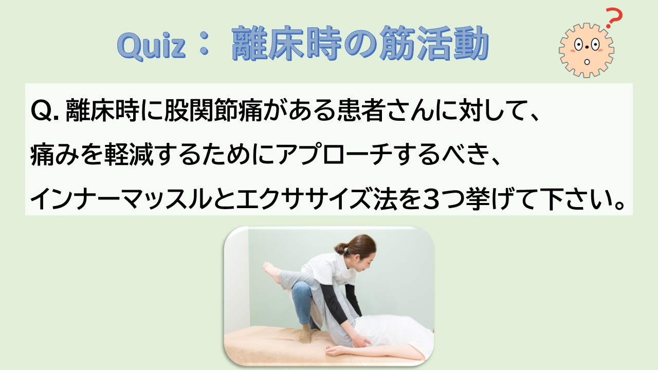 いよいよ来週に開催される実践講座、「離床を進めるためのインナーマッスルへのアプローチによる動作改善の極意」の内容から、問題をシェアします。