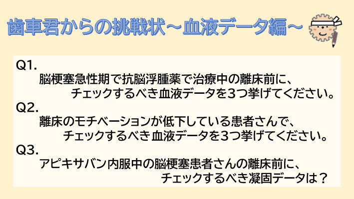 歯車くんから血液データにまつわるクイズを出題。臨床の腕試しに、是非、解いてみてください。