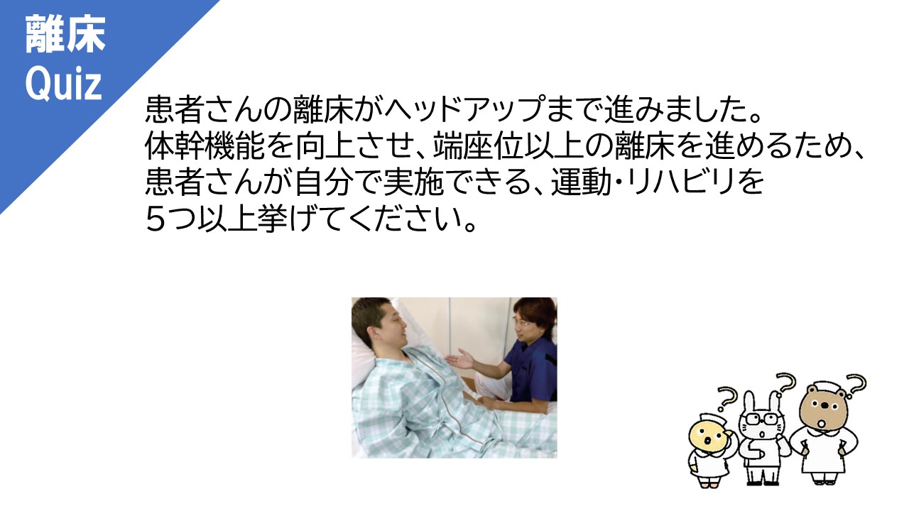 当会の人気講座、「ADLアップに直結!早期離床のワザと病棟リハビリ」の講座内容から問題をシェアします。5つ思いつかないという方は、下記講座の適応あり!