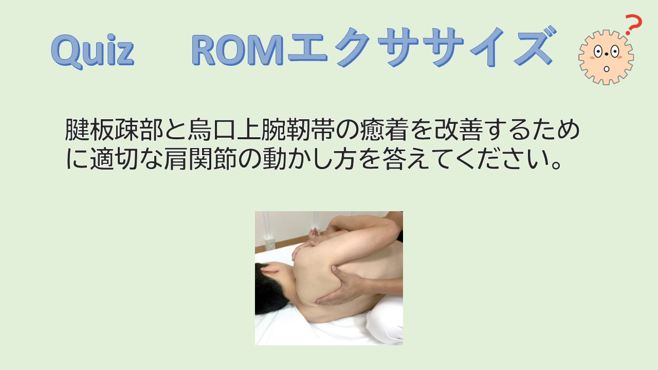 肩甲下筋を下方に引き下げ固定し、棘上筋の収縮を行わせることで、腱板疎部に剪断刺激を加える。さらに、肩下垂位で外旋を加え、肩甲帯を挙上することで烏口上腕靭帯に伸張刺激を加える。