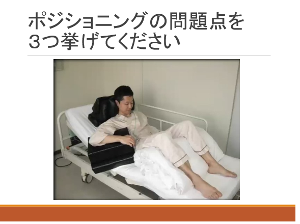 今週開催される実践講座、「日本離床学会 離床教育基礎プログラムII これができなきゃ始まらない!必修! 離床技術入門」からポジショニングに関する問題を出題