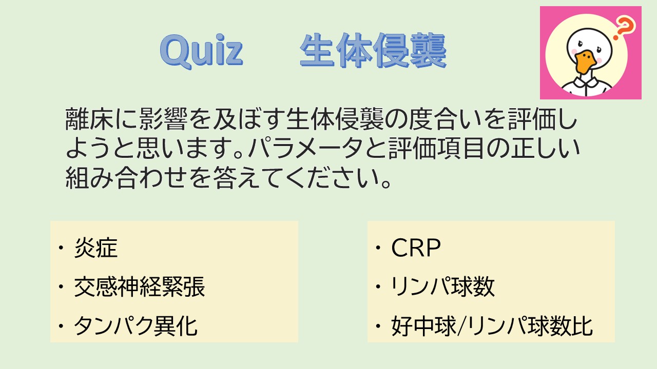 クイズについて上記離床で患者を救うための「生体侵襲学」マスターコースで詳しい解説があります。