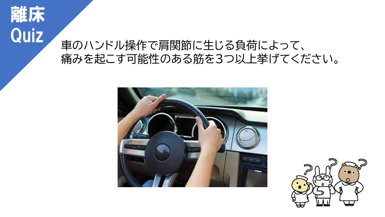 今回は来週開催される、「整形外科疾患関節への負担が少ない動作の極意~肩関節編~」の講座の内容より、クイズを出題。