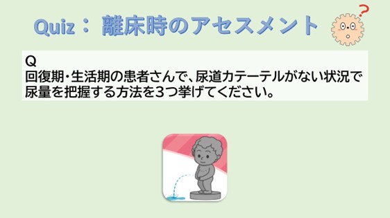 飲水量をみる、排尿回数から推測する、オムツの重量測定、ポータブルトイレで尿量測定など
