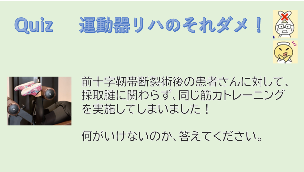 ACL再建術で採取する腱・靭帯により、トレーニングするべき筋は異なります。再建術で膝蓋腱を採取すると膝伸展筋力が、半腱様筋腱や薄筋腱を採取すると膝屈曲筋力が低下するため、採取腱により鍛えるべき筋が異なります。