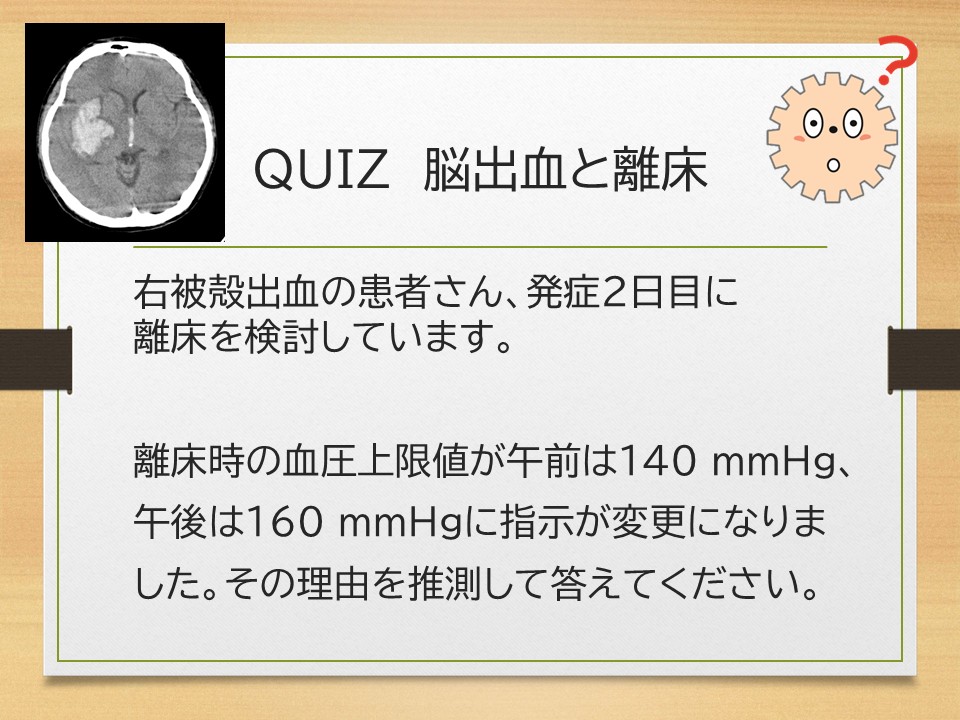 突然ですが、脳出血と離床に関するクイズを出題します。