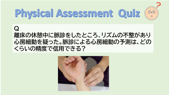 脈診による心房細動予測は、感度92%、特異度82%とかなり信頼できることが報告されています(文献)。離床時には脈の速さとリズムを必ずみるようにしましょう。