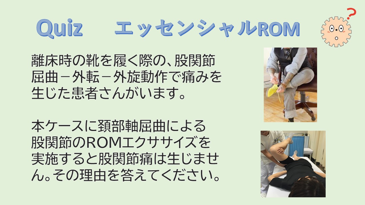 「機能解剖に基づく”エッセンシャル”ROMエクササイズ実践の極意」で習得できる技術から、ROMスキルクイズを出題。