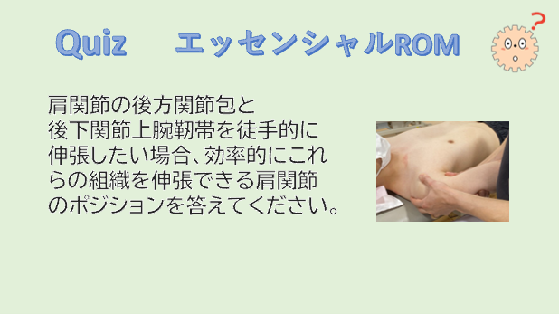 いよいよ今月開催される、実技プレミアムコース、「機能解剖に基づく”エッセンシャル”ROMエクササイズ実践の極意」で習得できる技術から、ROMスキルクイズを出題。
